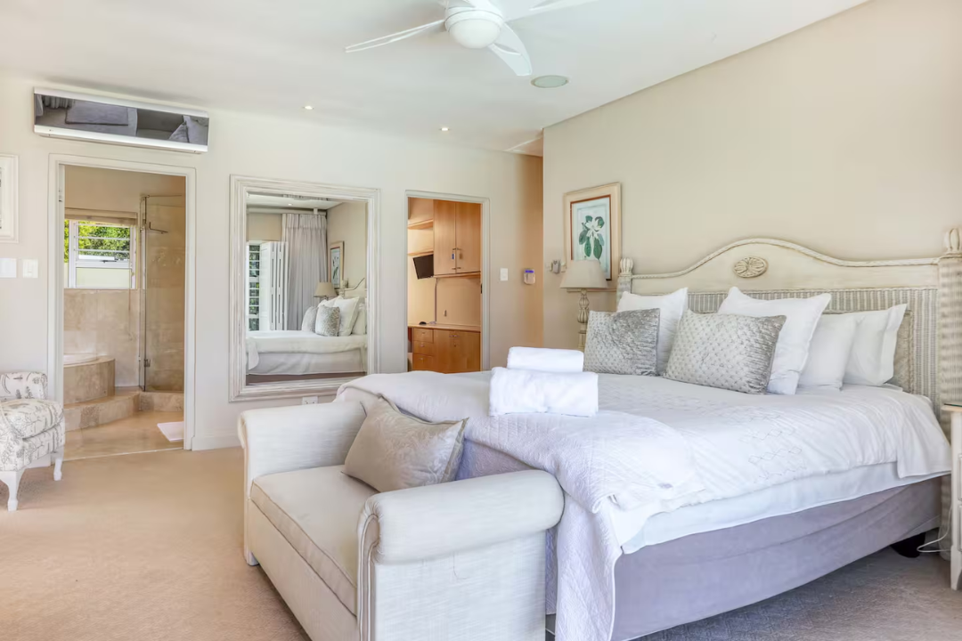 Master bedroom: King bed, en-suite with corner bath and shower, air-conditioning, and direct pool access.