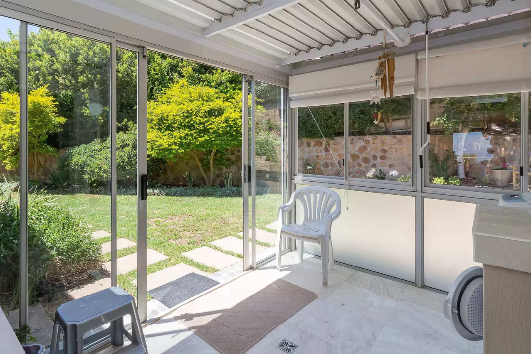 Second bedroom: Queen bed, access to a sunny courtyard, air-conditioning, ceiling fan, and shares a bathroom.