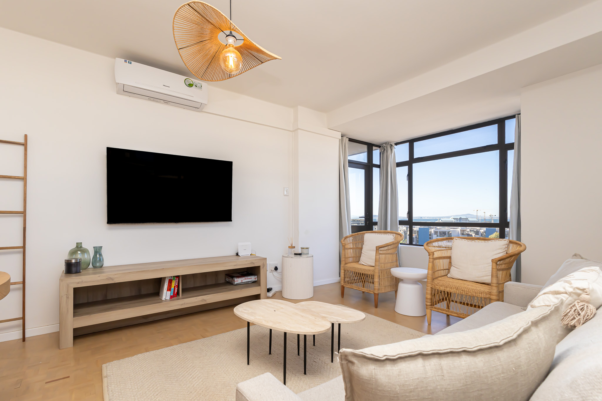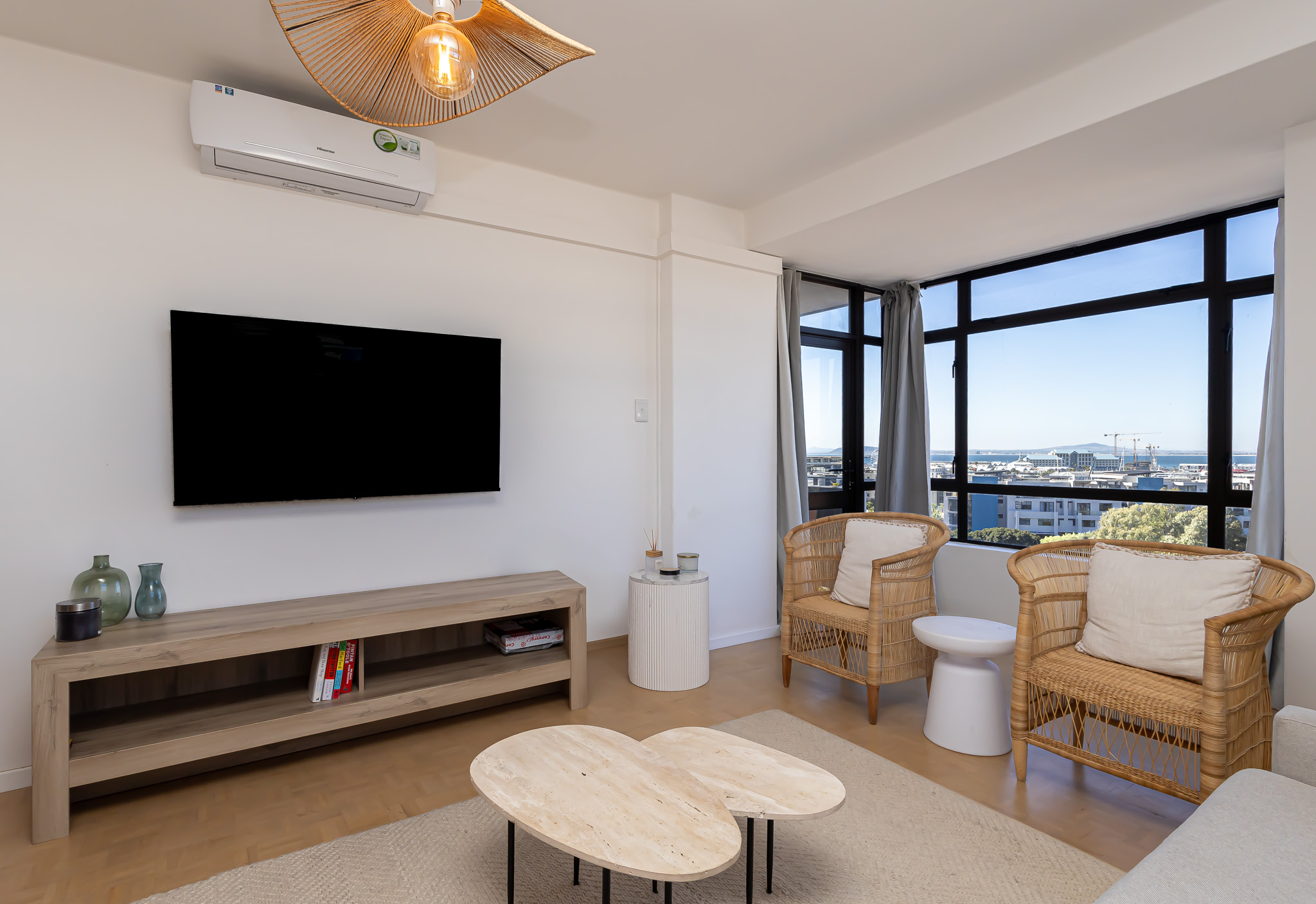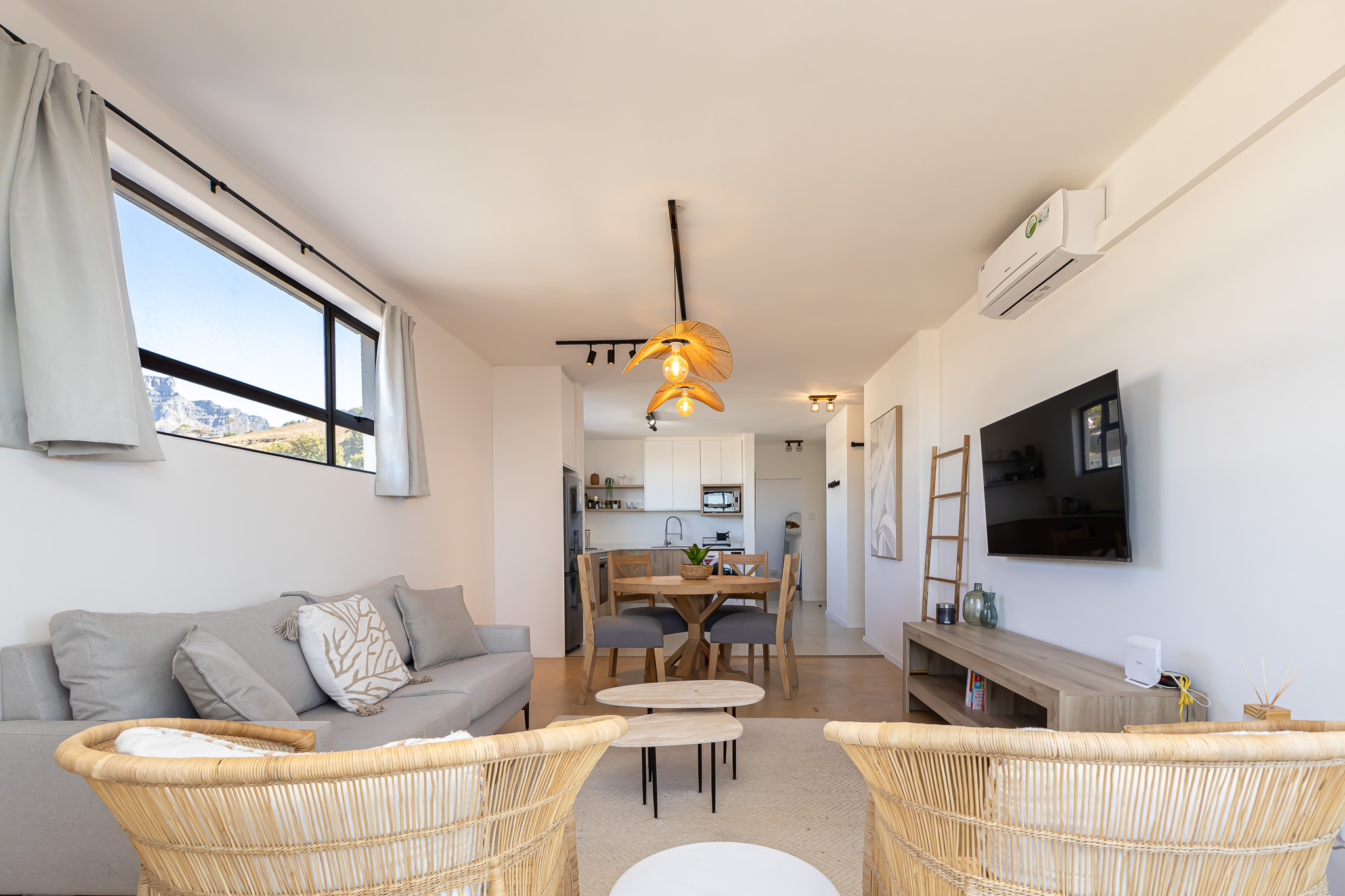 Modern, stylish, and perfectly located: This renovated apartment offers views of Table Mountain, the stadium, and the sea.