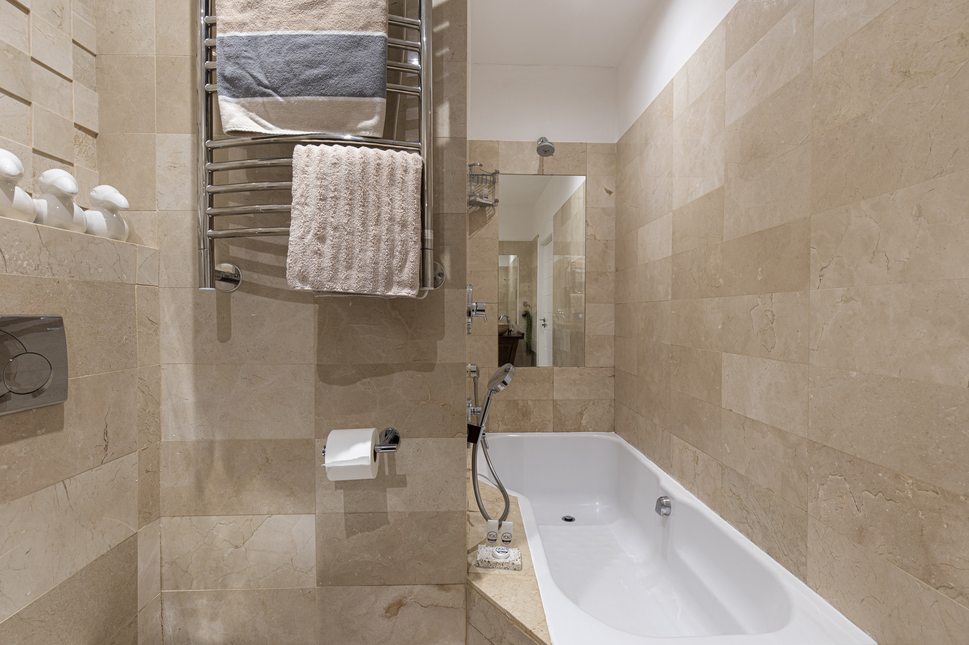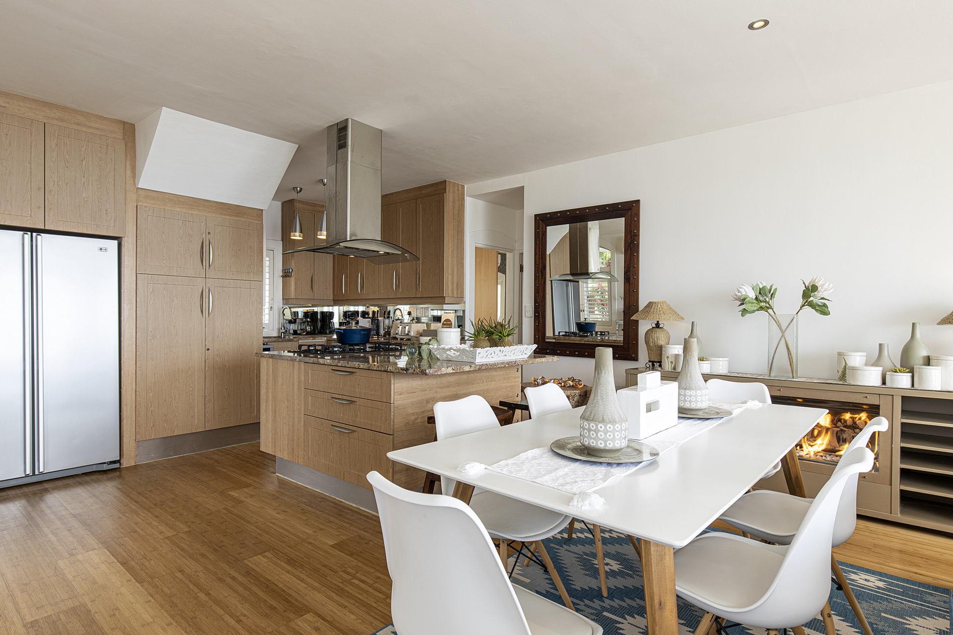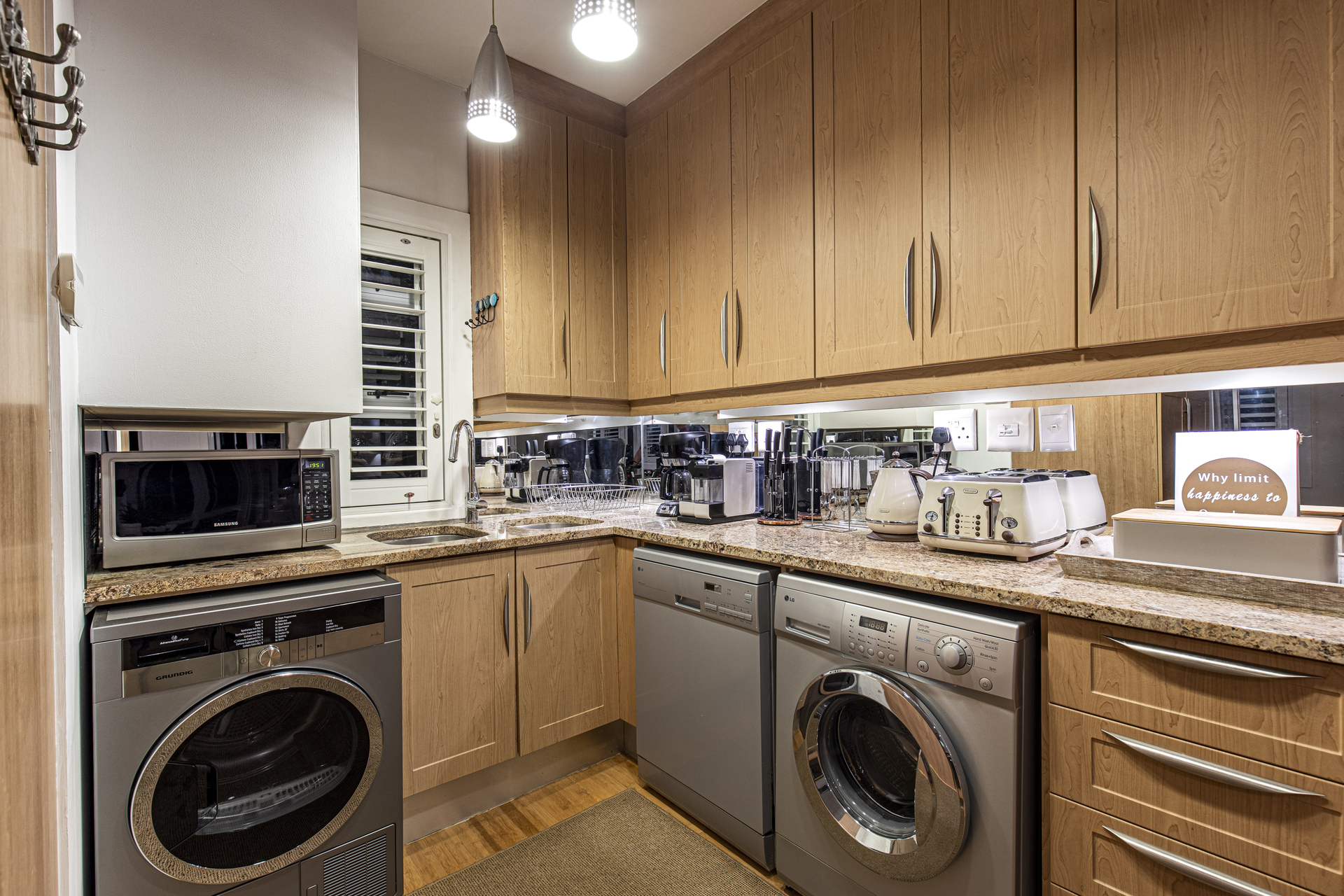 Inside, the air-conditioned open-plan kitchen, dining, and living areas are tastefully finished, fully furnished, and equipped with modern amenities. Highlights include a Nespresso machine, flat-screen TV with soundbar, Marshall speaker, and essentials like a dishwasher, washing machine, and tumble dryer.