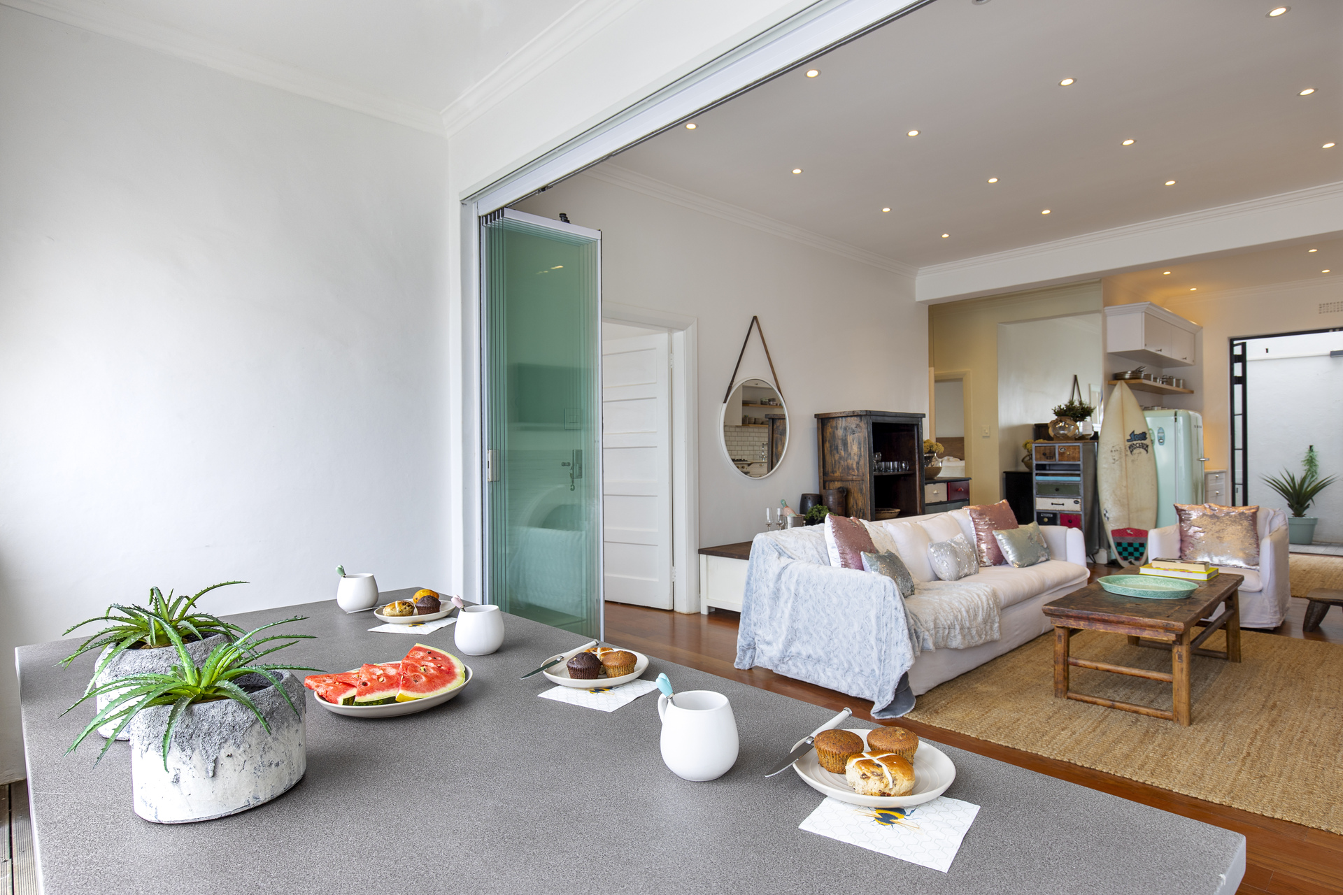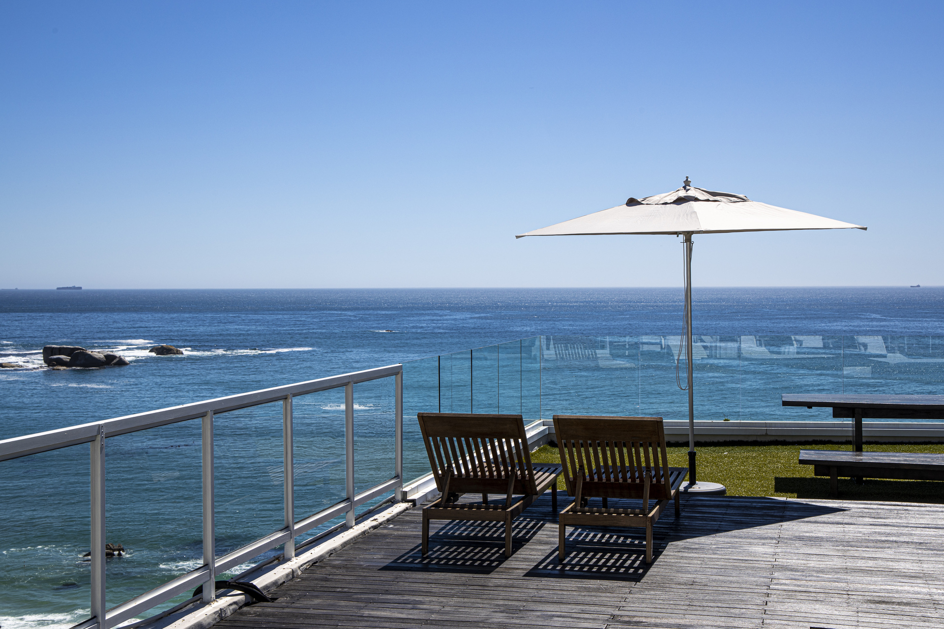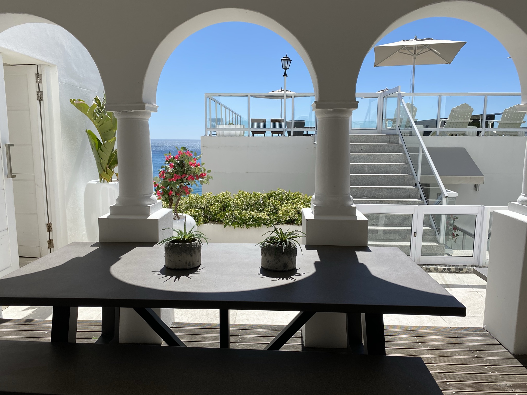 Step through sleek foldaway glass doors to enjoy partial ocean views from the living area and the covered terrace. Sip your morning coffee in the serene courtyard, indulge in a late breakfast, or unwind with sundowners in your own tranquil outdoor space.