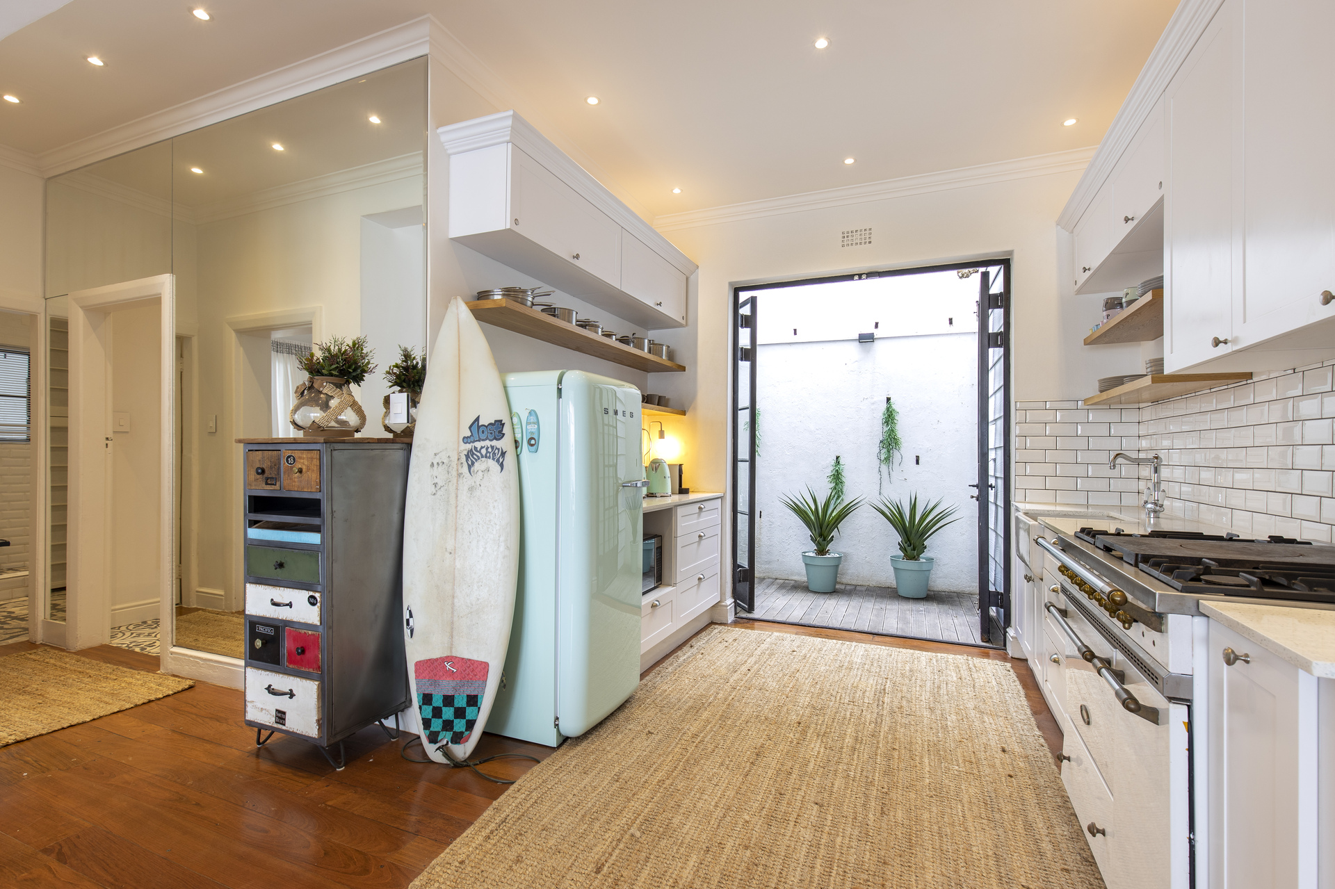Experience modern luxury and vibrant style in this ultra-chic apartment, boasting a stunning private courtyard and garden. The two spacious bedrooms, both opening onto the courtyard, feature elegant Italian-tiled bathrooms. The air-conditioned, open-plan living space is designed with contemporary flair and comes fully furnished with high-end amenities, including a Nespresso machine, flat-screen TV with sound bar, Marshall speaker, washing machine, and tumble dryer.