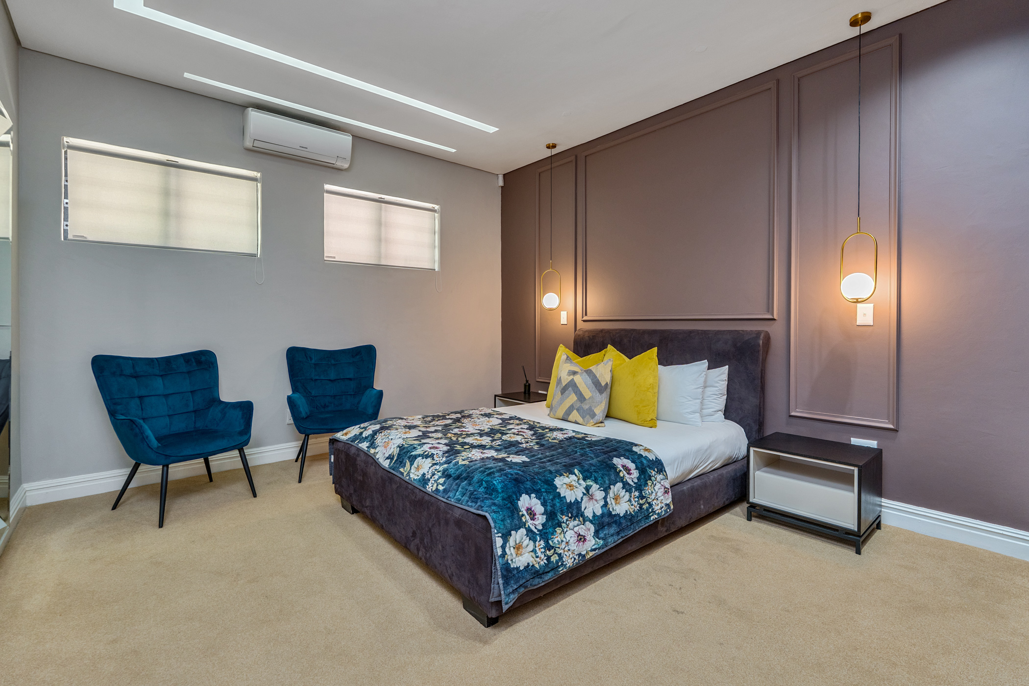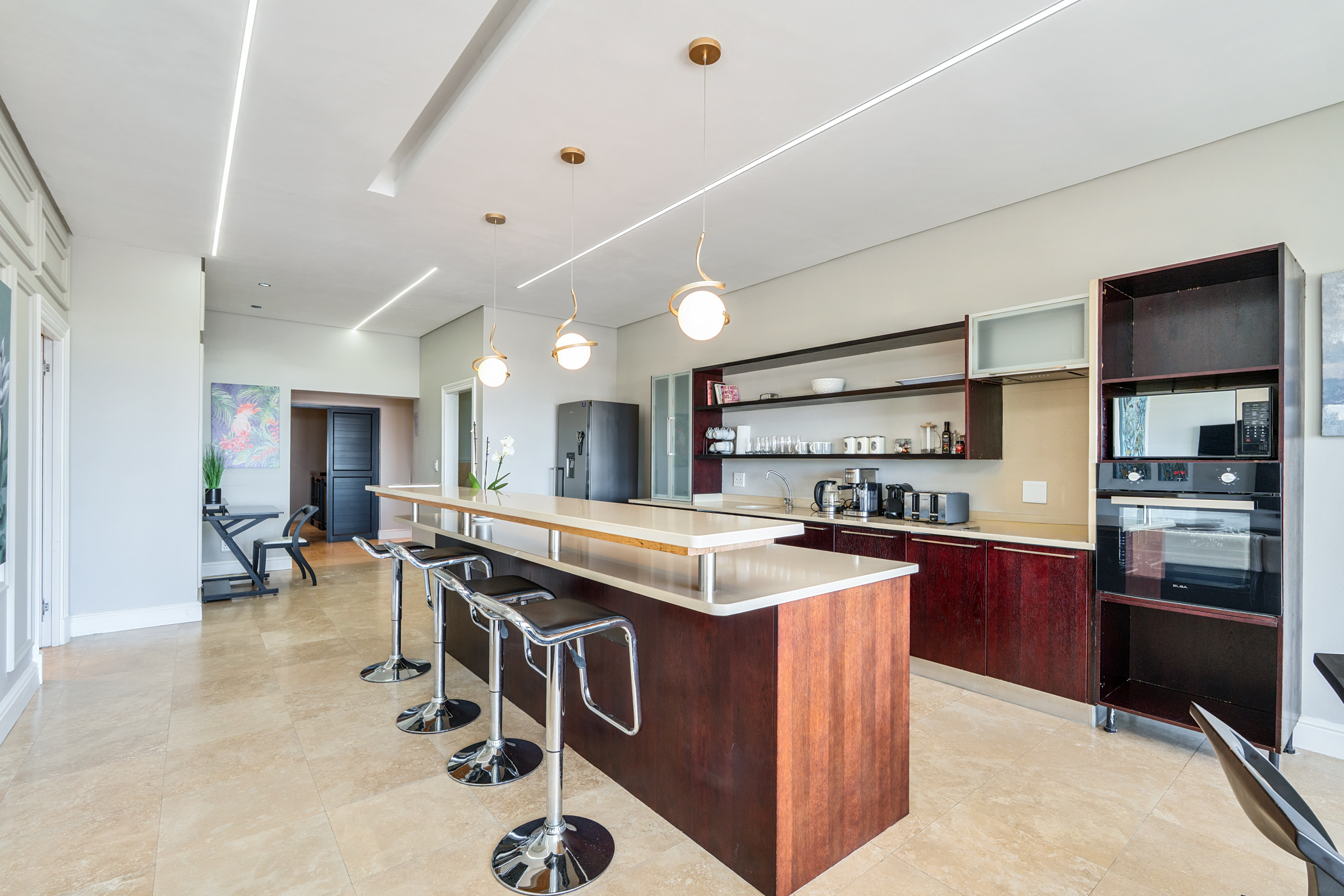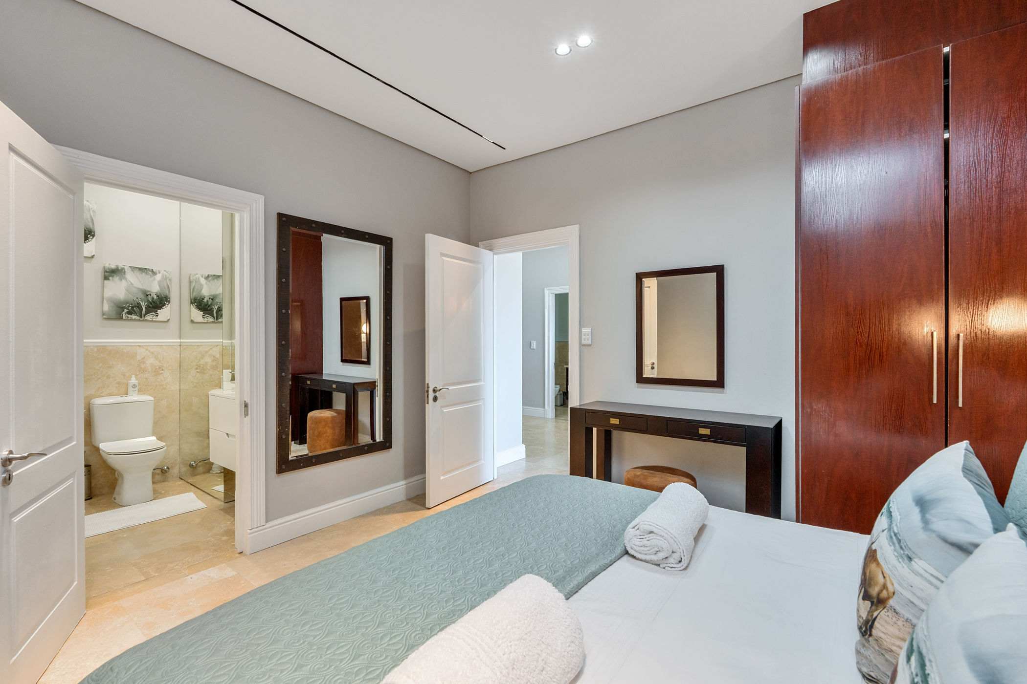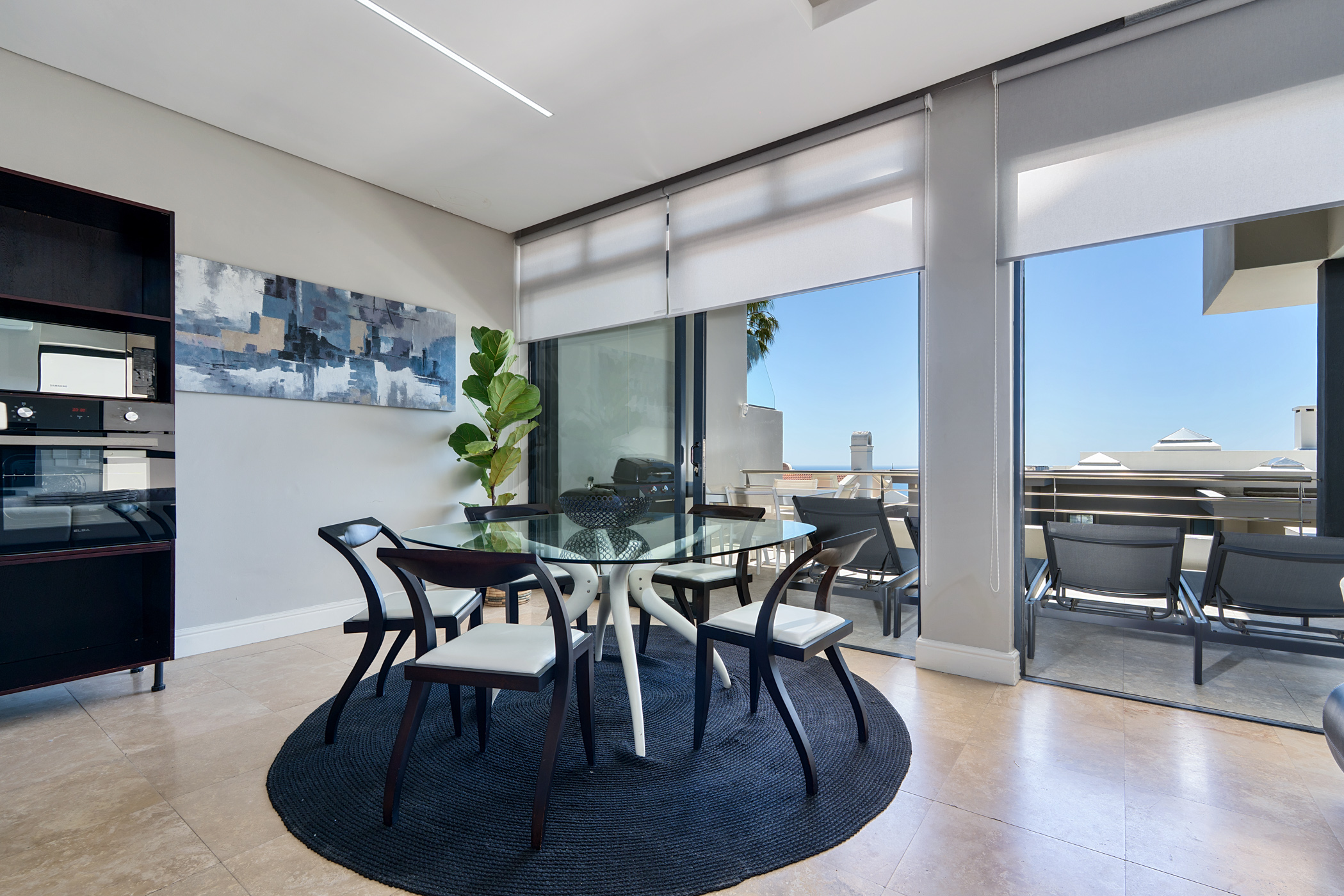 This 110m² apartment offers a secure and stylish living experience in one of Cape Town’s most desirable locations. With two en-suite bedrooms and an open-plan living area, it’s well-suited for short-term stays or extended visits. The unit features a private patio and plunge pool, complemented by ocean views and outdoor seating.